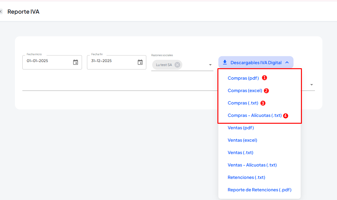 Reporte de IVA compra en PDF y Excel, además de poder descargar el txt y alícuotas