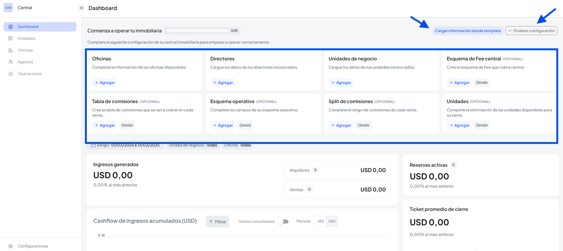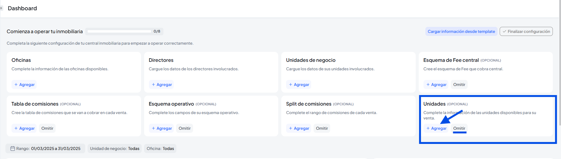 Importante: Es posible subir la información de forma masiva mediante la utilización de templates, adicionalmente si completaste la configuración inicial podes hacer clic en finalizar configuración y la misma desaparecerá para que puedas visualizar únicamente tus métricas.