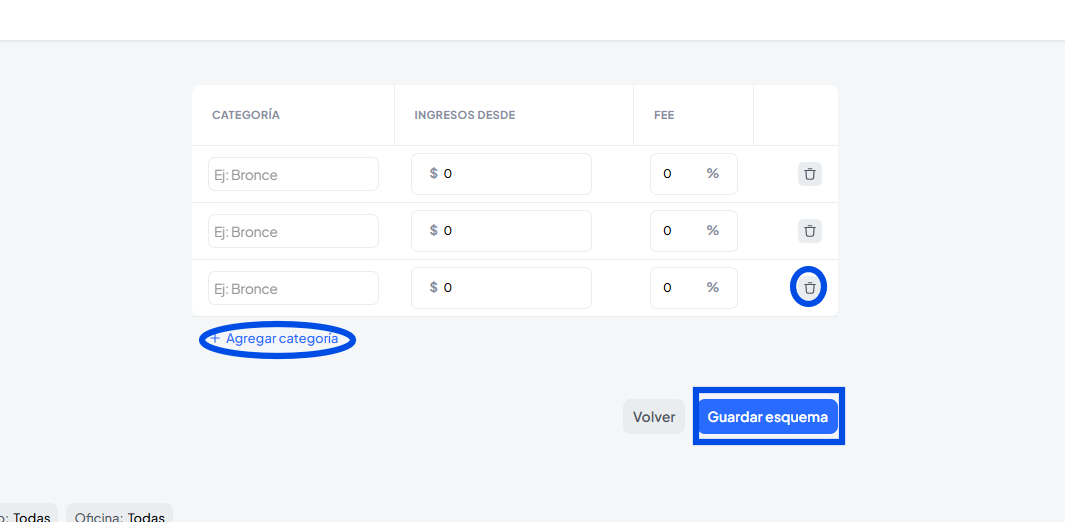 En esta opción podrás configurar comisiones a una oficina por el uso de la marca, los mismos se pueden fijar según el nivel de facturación