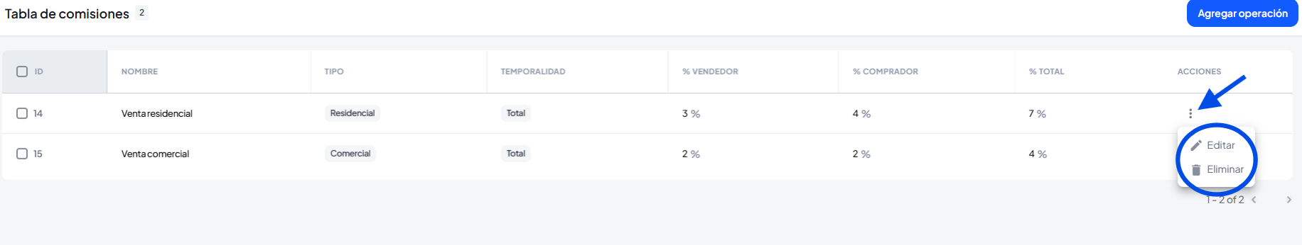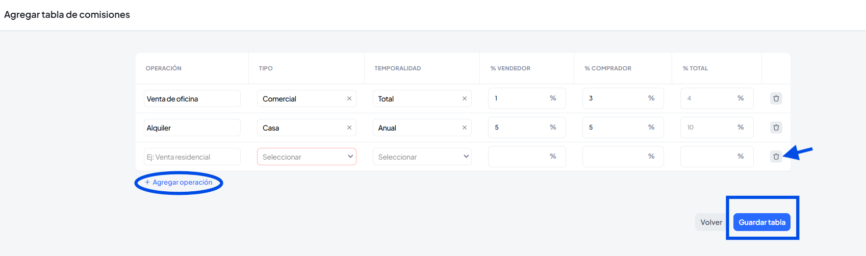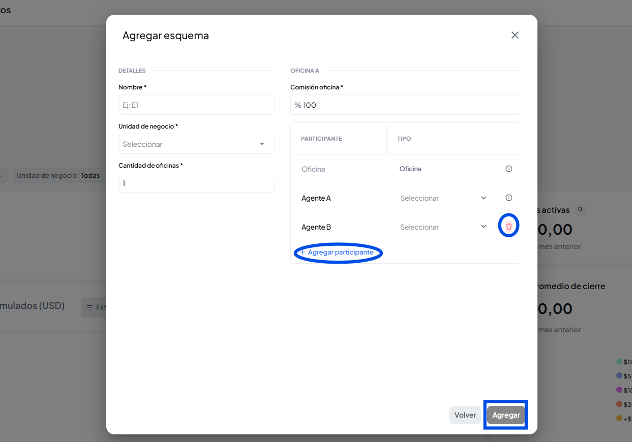 Se abrirá una ventana donde ingresaremos el porcentaje de comisión por el tipo de operación, podes eliminar los campos extras de agentes así como agregar mas participantes