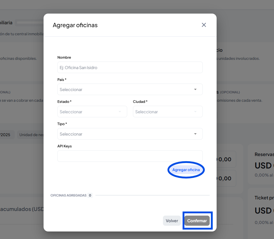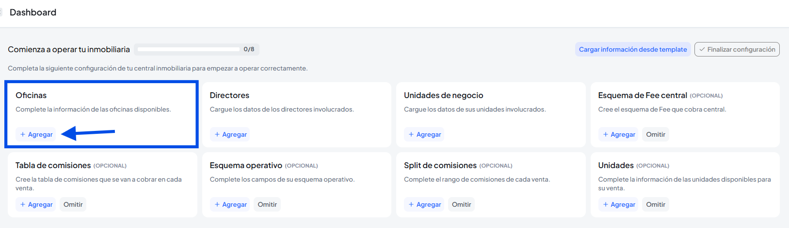 Podes crear tus oficinas desde la configuración inicial, haciendo clic en agregar