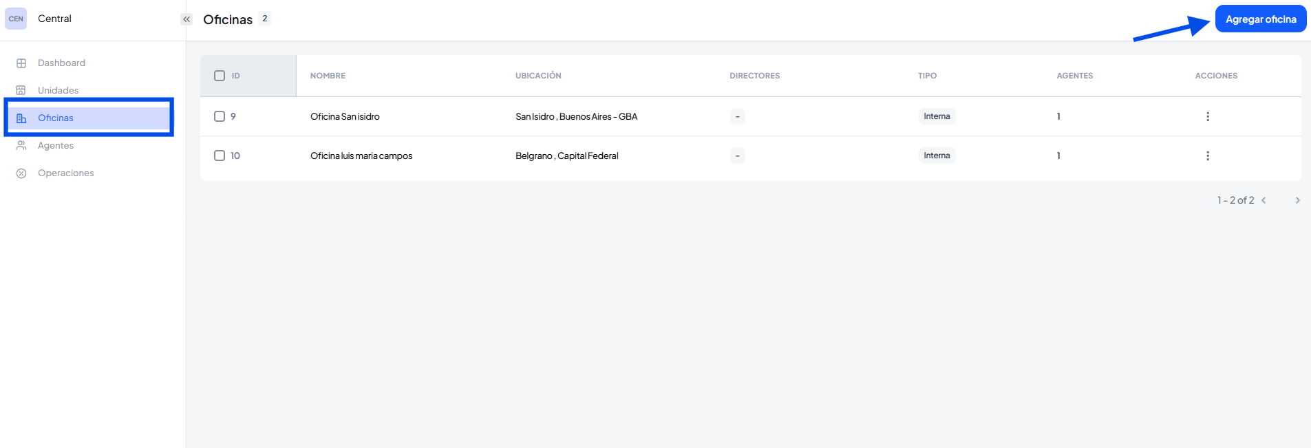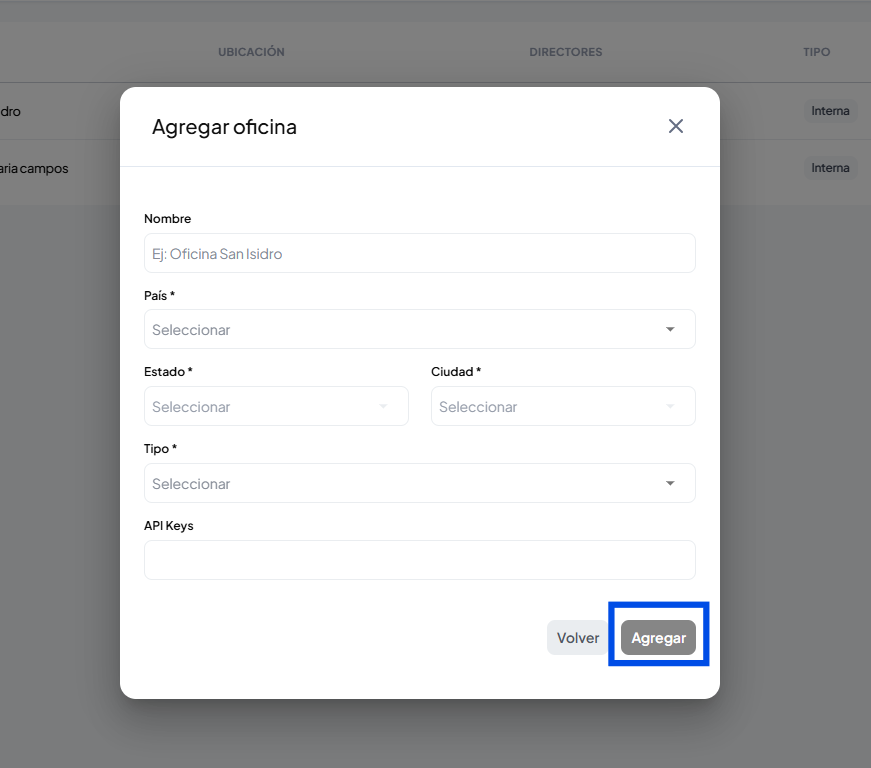 También podes agregar nuevas oficinas en la sección de oficina, haciendo clic en agregar