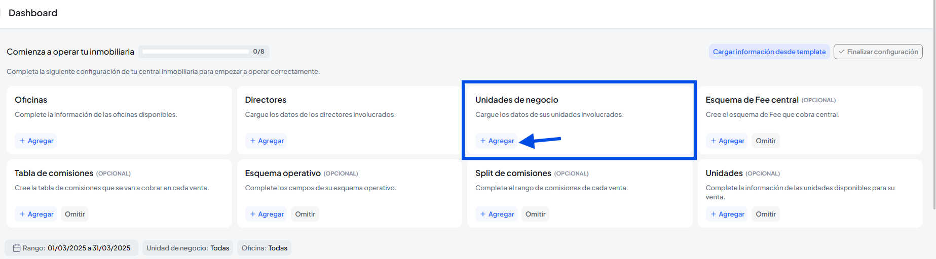 Podes crear tus unidades de negocio desde la configuración inicial, haciendo clic en agregar