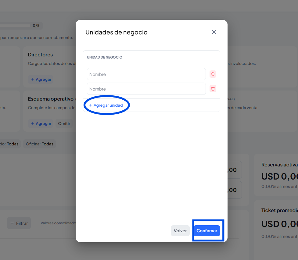 Se abrirá una ventana para ingresar tus unidades de negocio, podes eliminar campos asi como agregar las N cantidades de negocio que poseas.
