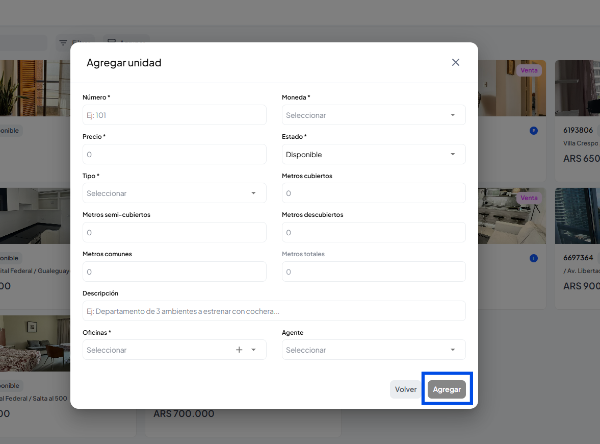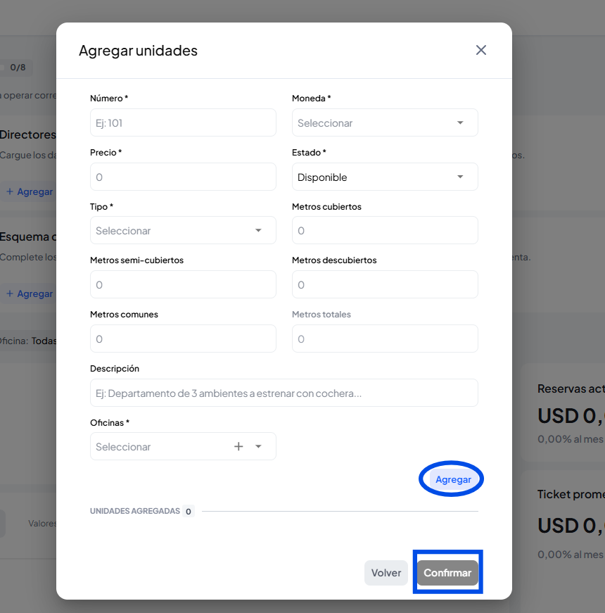 Se abrirá una ventana para ingresar todos los datos de la unidad, haciendo clic en el botón de agregar poder seguir sumando unidades