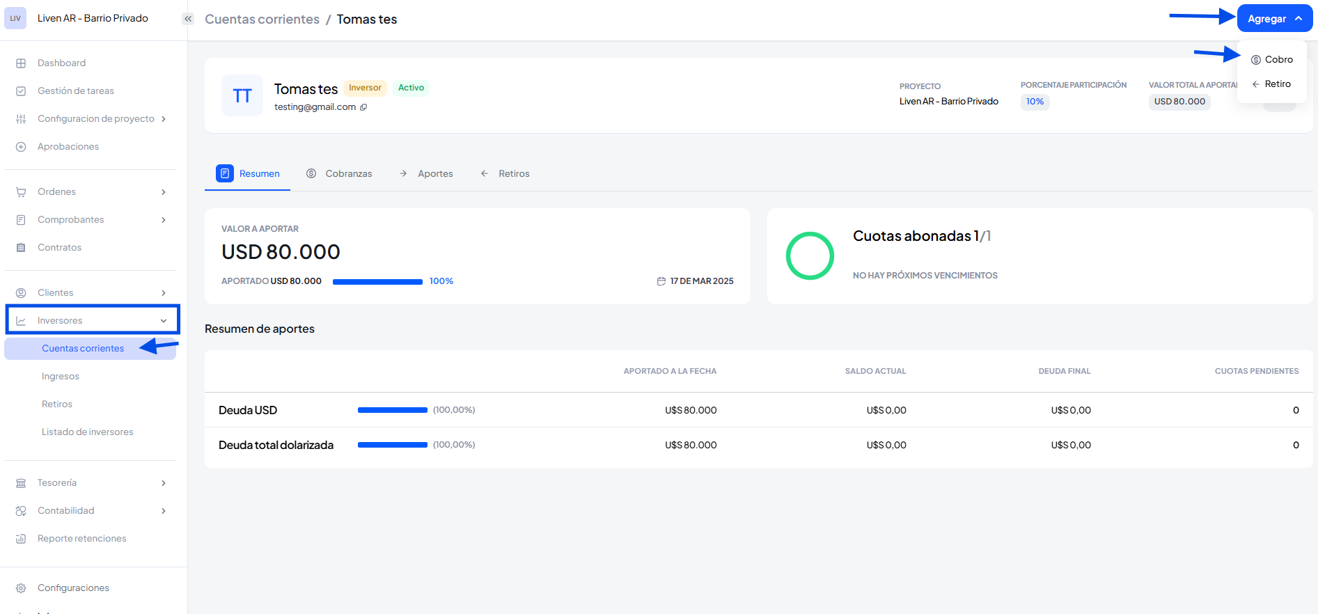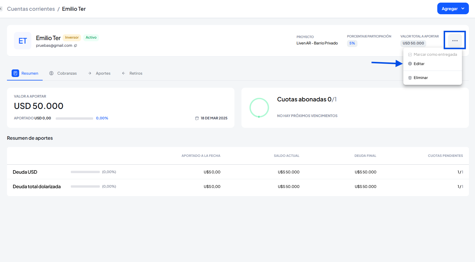 Para registrar un Aporte o Ingreso de socios, podremos hacerlo directamente desde la cuenta corriente o desde el listado.