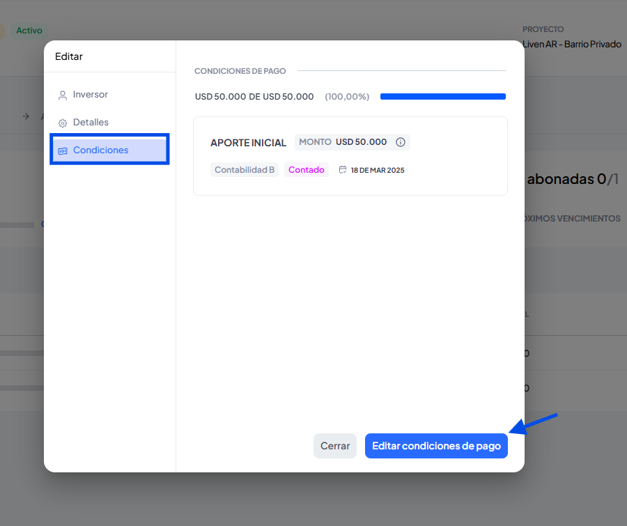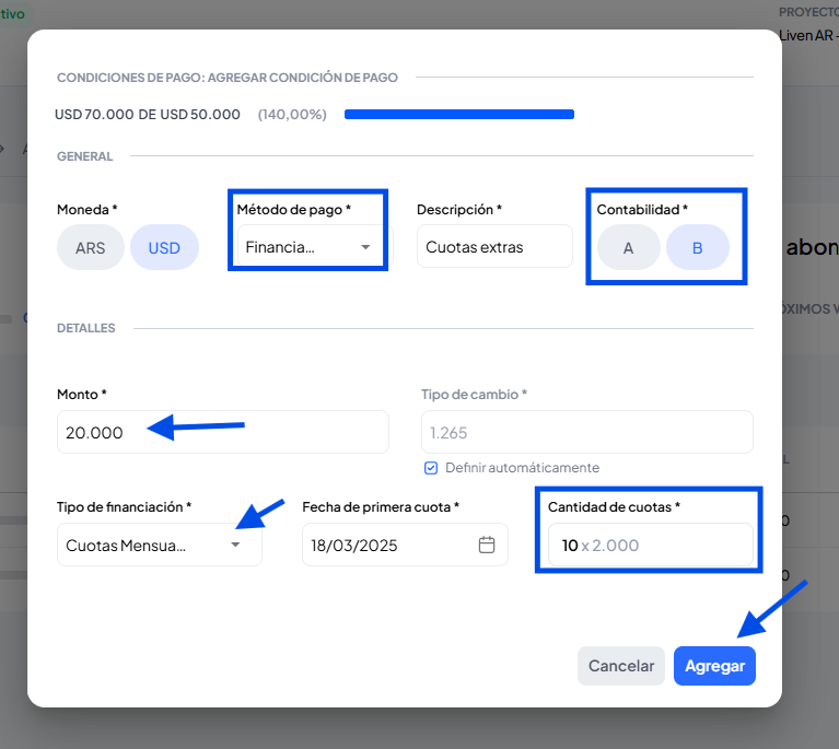 5. Clic en editar condiciones de pago, Agregar
