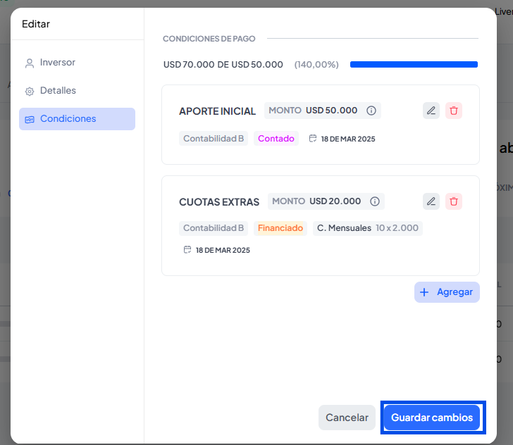 7. Clic en Guardar cambios ¡Listo! La condición se ha guardado vas a poder realizar el cobro.