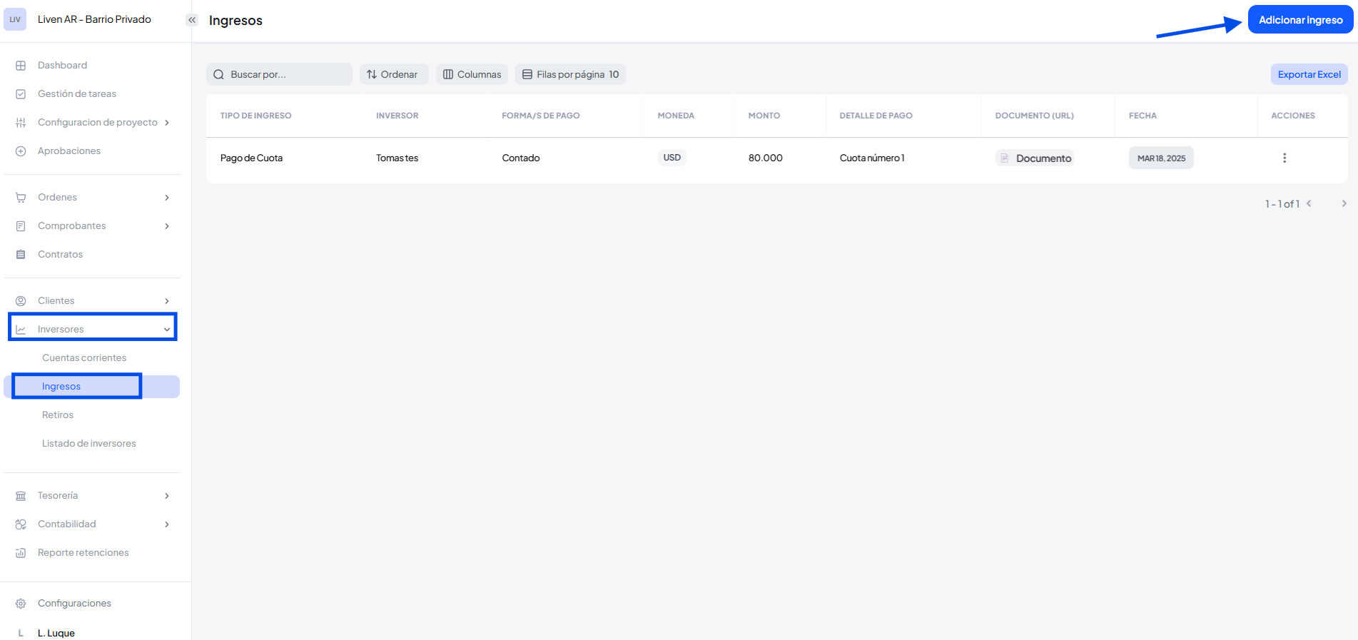 3. hacer clic en el botón de adicionar Ingreso