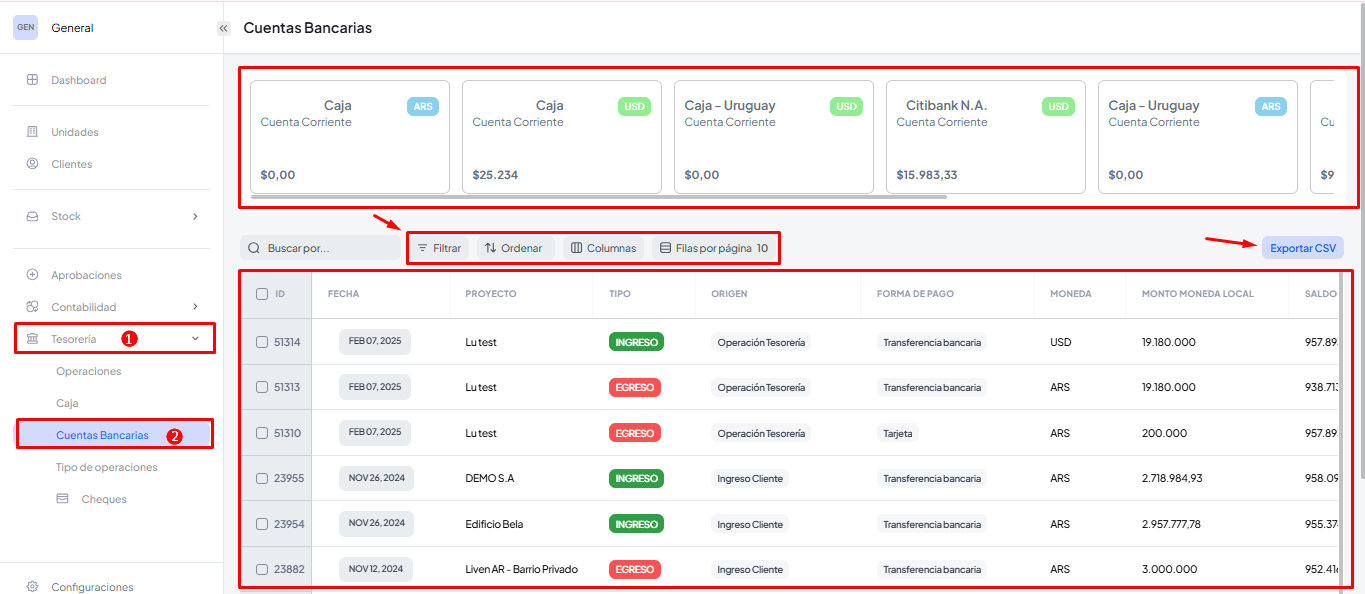 Vamos a poder visualizar todos nuestros bancos con su saldo, además de poder ver los movimientos/operaciones relacionados. También podrás exportar tu información en formato CSV