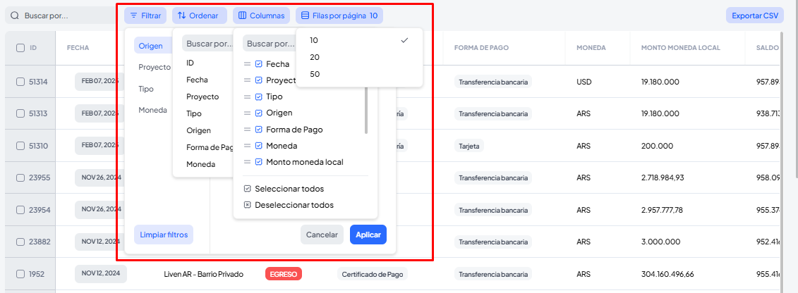 Adicionalmente tendrás la posibilidad de ordenar los datos, visualizar o no columnas e indicar la cantidad de operaciones que deseas ver en la vista.