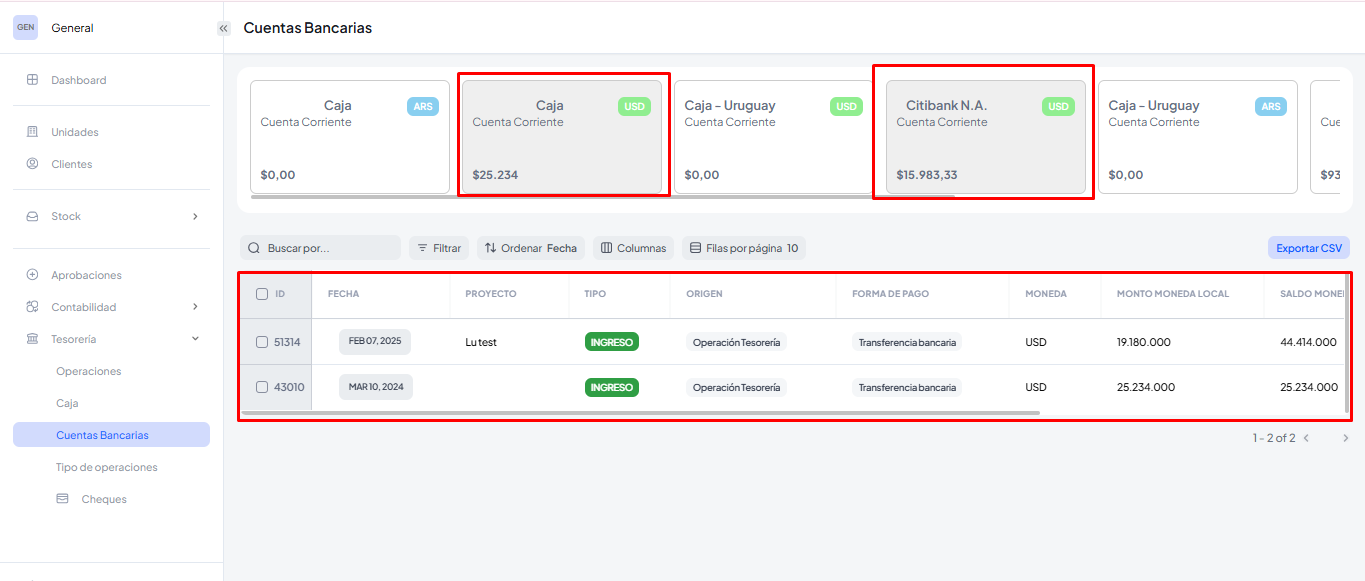 Paso4: Si deseas ver solo los movimientos de una caja, solo debes seleccionarla y la plataforma te mostrar solo los movimientos pertenecientes a ese/esos banco/s