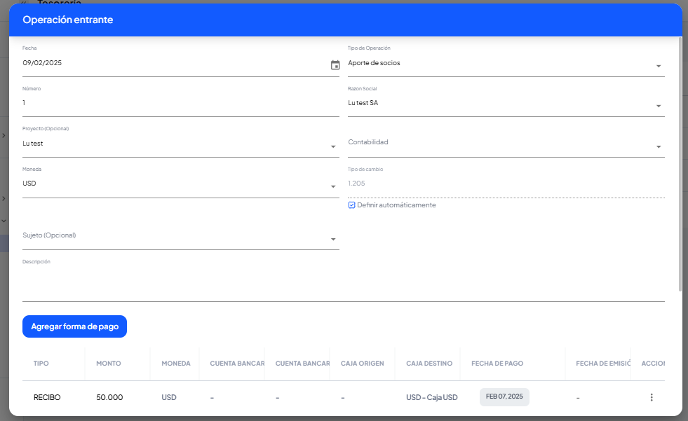 Paso 6: Agregaremos la forma de pago donde indicaremos, si fue en efectivo, movimiento bancario, cheque, monto, caja.